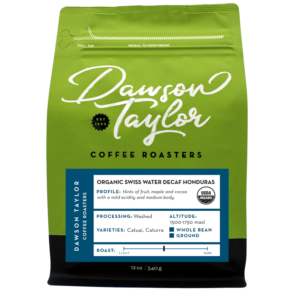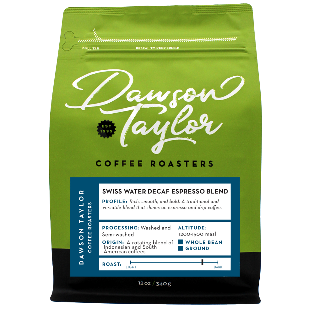 Explore Dawson Taylor’s Swiss Water Decaf Coffees — enjoy rich, flavorful decaf options like Espresso Primo, Colombia, Brazil, and organic Honduras & Guatemala.