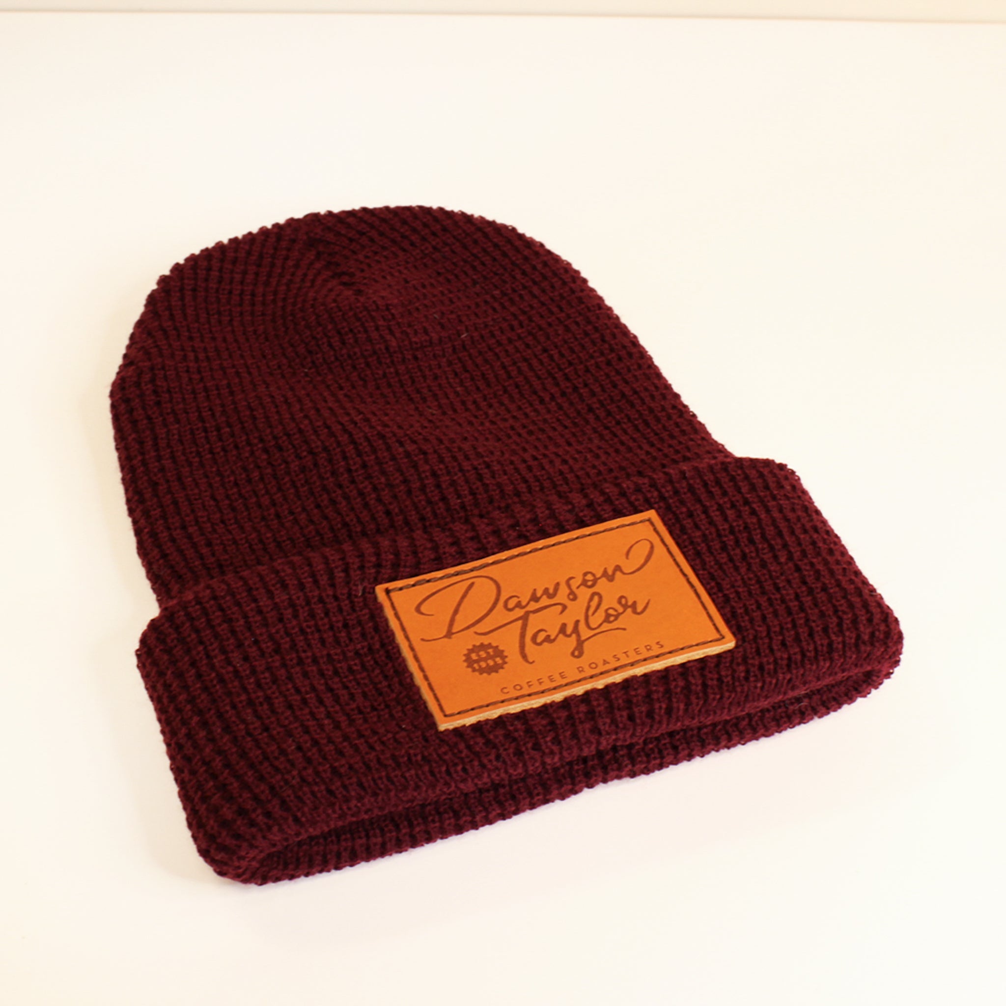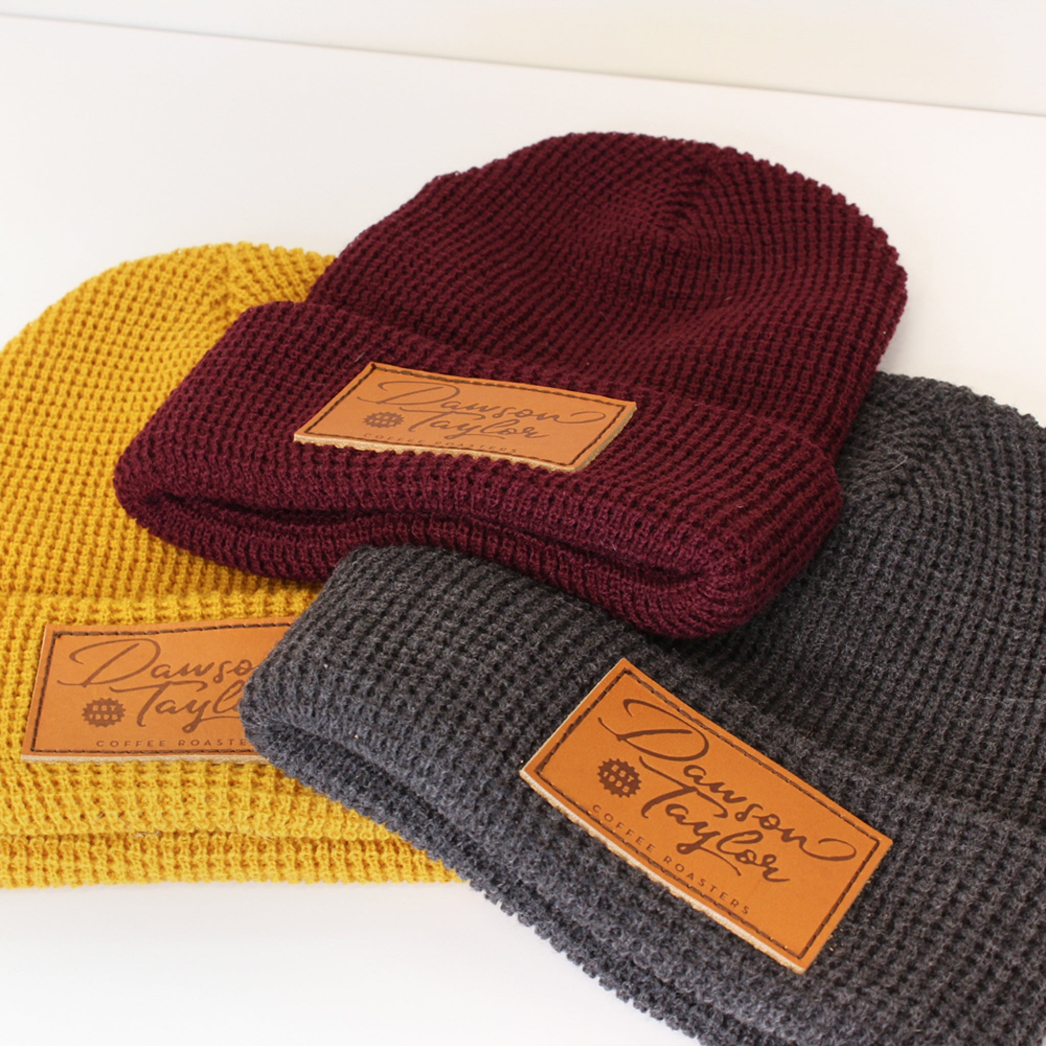 Warm up with a waffle-knit Dawson Taylor beanie with a custom leather patch. Soft, stretchy, and cozy. The waffle knit fabric is light enough to wear all day, yet keeps you nice and warm.